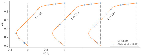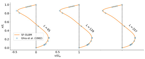 Figure 6 shows the steady-state horizontal velocity profile along the vertical line through the center of the cavity for different grid sizes. The results are compared to the benchmark solutions of Ghia et al. [64] obtained by solving the Navier–Stokes equations. The OLBM results from the grid are already in close agreement with the benchmark solutions. Analogously, the vertical velocity profiles along the horizontal center line are shown in Figure 7. Again, we observe good agreement with the benchmark results as the grid size is increased.