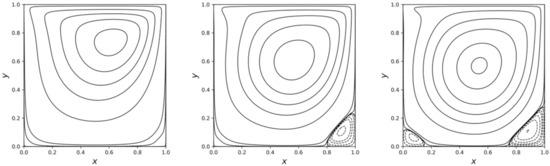 Streamlines of the lid-driven cavity flow at Reynolds numbers. From left to right are 100, 400, and 1000. The contour values of the stream function are the same as those in [64].
