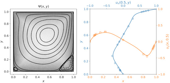 - Ghia, U.; Ghia, K.N.; Shin, C. High-Re solutions for incompressible flow using the Navier-Stokes equations and a multigrid method. J. Comput. Phys. 1982, 48, 387–411. [Google Scholar] [CrossRef]
