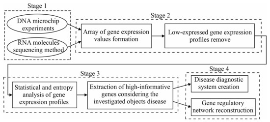 An analysis of gene expression experimental data allows concluding [1] that generally, the human genome contains approximately 25,000 active genes (not zero expression values). Approximately, the same number of genes are inactive ones (zero expression values). Which genes are currently active depends on the nature of the biological organism and its current state. Therefore, processing gene expression data to extract genes that allow us to adequately distinguish the studied biology objects is an important step of gene expression data pre-processing. In this instance, symmetry plays a key role in the field of both genes’ and/or proteins’ interaction since it undergirds essentially all interactions between molecular components in the gene regulatory network and extraction of gene expression profiles, which allows us to identify how the investigated biological objects (disease, state of patients, etc.) contribute to the further reconstruction of the gene regulatory network (GRN) in terms of both the symmetry and understanding the mechanism of molecular element interaction in a biological organism. The step-by-step procedure of gene expression data formation and processing for the purpose of GRN reconstruction and/or creation of a diseases diagnostics system is presented in Figure 1 [2]. As can be seen, the implementation of this process involves four stages: Performing the experiment; formation of an array of gene expressions and removing unexpressed and low-expression genes for all studied samples; statistical and entropic analysis of the obtained gene expression profiles in order to identify mutually correlated genes that allow us to distinguish the investigated samples with high resolution; reconstruction, validation and simulation of GRN or creation of a disease diagnostic system.