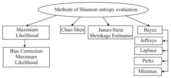 An analysis of literature resources [27,28,29,30,31] allows concluding that the existing methods of the Shannon entropy calculation differ in the method of probability evaluation of the implementing corresponding state of the system. and, in the general case, can be divided into two groups. The first group of methods is based on estimating the frequencies of appropriate state of the system. The methods of the second group involve the evaluation of the entropy directly without the use of frequencies of the system’s corresponding states. A block chart of the most common methods for estimating Shannon’s entropy is shown in Figure 2.