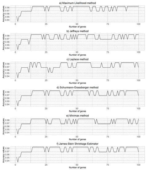 Figure 5 presents diagrams of the classification accuracy criterion distribution calculated by Formula (23) when the number of the nearest gene expression profiles stepwise increases from 2 to 100.