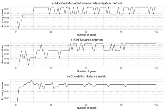 An analysis of the obtained results allows concluding that an application of the MMIM proximity metric really contributes to increasing the objectivity of similar gene expression profiles’ extraction. The extraction of gene expression profile groups allows us to classify adequately and with high accuracy (99%) the examined objects. The increase of the objectivity, in this case, is due to the correct use of a set of methods for calculating Shannon’s entropy, the value of which is used for assessing the MIM values of the respective gene expression profiles. The simulation results have also shown the lower efficiency of the correlation distance metric compared with both the MMIM criterion and Pearson’s test in terms of both the absolute value and sensitivity. As shown in Figure 6, the classification accuracy values, when using the correlation proximity metric (Figure 6c), are varied within the narrow range of about 0.95 classification accuracy value. When using other proximity metrics (Figure 6a,b), in the case of a low number of gene expression profiles, the classification accuracy values are varied chaotically within the larger range. This is natural, since adding several gene expression profiles in this instance can significantly change the classification results. When the number of genes is larger than 40 (approximately), the classification accuracy values were varied around larger values compared to when we applied the correlation proximity metric.