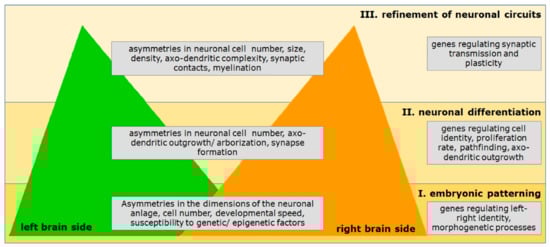 Model of the hierarchical development of brain lateralization—the three main phases of neuronal development are dominated by different cellular processes, which lead to an increasingly lateralized functional organization of the two hemispheres (indicated by the green and orange triangles). In each phase, certain types of genes regulate differentiation and, thus, asymmetry formation.
