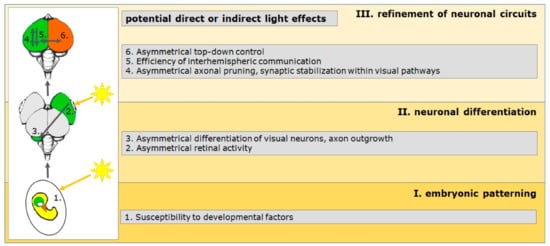 - Although visual systems are not developed, there is some evidence that during this phase, light stimulation already affects the establishment of some aspects of lateralization in both chickens and zebrafish [166,175,176,177] (Figure 2). Transduction mechanisms mediating these light effects are unknown but might include epigenetic mechanisms [166,177]. It is also possible that some genes unfold their actions only after photostimulation [178].