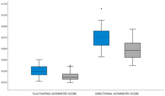 Box plots of fluctuating and directional asymmetry scores of the scoliosis (blue) and control group (grey). Black dots represent outliers and significant differences were observed between groups in both variables.