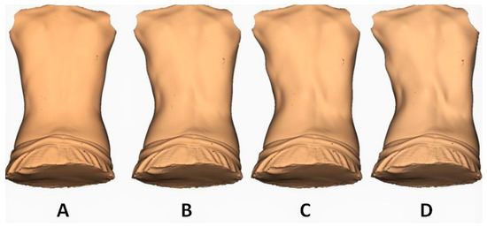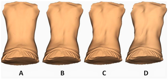 Simulated effect that the increment of directional asymmetry may cause in the three-dimensional shape of the torso. Scale factors are: (A) = 0, (B) = 0.06, (C) = 0.08 & (D) = 0.1.