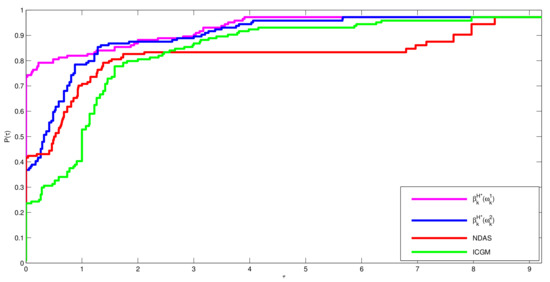 From Table Table 1, which includes Problems 1–2, it can be observed that our algorithm wins both the number of iterations and the CPU time, followed by the ICGM and NDAS algorithms. Nevertheless, note that the NDAS method failed to solve Problem 1 for almost six initial points, while the NDAS method has an advantage over the ICGM method for Problem 2 both for the number of iterations and computing time. Similarly, for all remaining problems, our algorithm has the less number of iterations and CPU time, except for Problems 5 and 8. For these two problems, the NDAS and ICGM methods have substantially less computing time and compete with the proposed algorithm for the number of iterations. We provide a picture of the overall performance for both the number of iterations and the CPU time using the Dolan and Moré [30] performance profile. Based on their profile, the best method is the method whose curve is at the top left corner. It could be observed that our algorithm reflected the top left curves in Figure 1 and Figure 2 for the number of iterations and the time of the CPU, respectively. This clearly shows that our algorithm is the best in terms of the number of iteration and CPU time compared to the NDAS and ICGM algorithms.