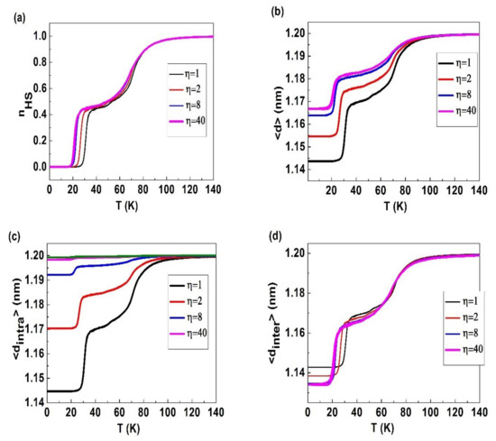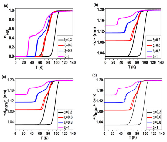 In Figure 3e, we plotted the corresponding thermal dependence of the order parameter given in Equation (7), which quantifies the degree of ordering between consecutive binuclear units. In the HS and LS states, one has , which means that sublattices A and B are equivalent. In contrast, in the plateau region where (i.e., ), the curves reach a maximum indicating the existence of LS = LS-HS = HS ordering. This order is partial for = 0.2 and becomes almost complete in the whole plateau region for , indicating the existence of a symmetry breaking between the sublattices which couple in an antiferro-elastic fashion.