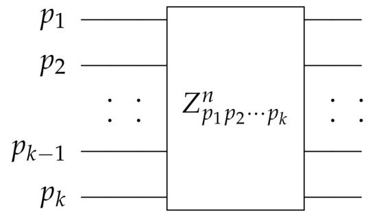 Given a () reversible gate Z acting on reversible circuit, the Z gate is denoted as , where the superscript represents the number of bit wires in the reversible circuit and the subscript taking as the indices of the control bits and as the index of the target bit, as shown in Figure 1.