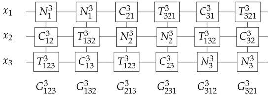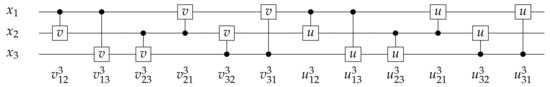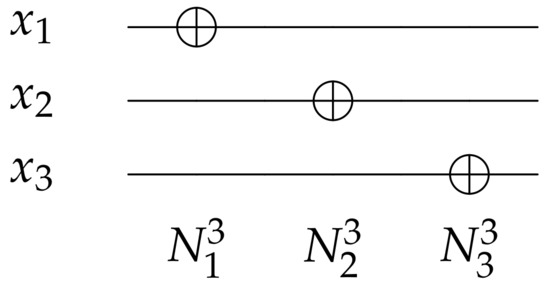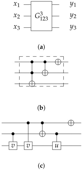 The gate library was introduced by Younes [21]. It is a reversible universal gate library that can be used to synthesize any reversible circuit with n-input/output variables, for . The associates gate, gate and the gate to build a library that acts on n-bits circuits. Figure 6 illustrates the library in a circuit of three bits. The action of the G gate acting on three bits indexed in a circuit of wires can be described as follows:
