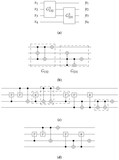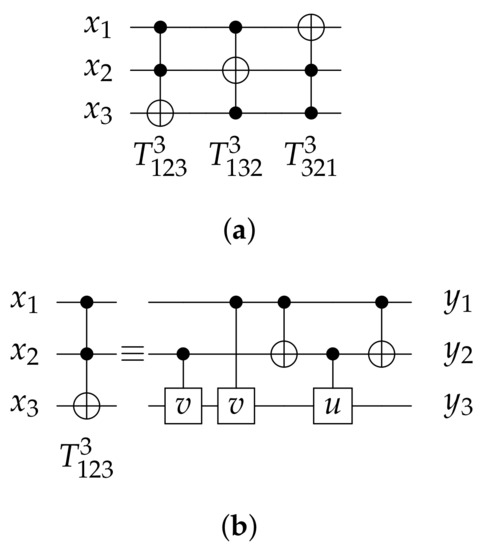 The Toffoli T gate [29] is a reversible Boolean () gate that takes three input bits and produce an output by flipping the target bit if and only if the control bits are set to one, as illustrated in Figure 5b. The T gate can be decomposed to five () elementary gates [30,31], as illustrated in Figure 5b, and thus it has a quantum cost of five. The action of the T gate acting on wires indexed is described as follows: