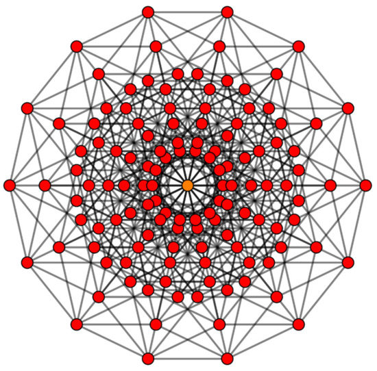 Consequently, as seen from the above matrix, the diagonal elements in the inverted order, that is, q = 7 being the first and q = 1 being the last diagonal element, enumerate the number of hyperplanes. Hence the first row of the above matrix represents the vertices of the 7D-cube, the second row represents the edges, the third row is for square faces, and the last row represents the hexeracts. It can be readily seen that there are 14 hexeracts while there are 672 faces. Likewise, the off-diagonal elements of the matrix shown above, Cij represents the number of times the hyperplane j occurs in the hyperplane i. To illustrate, C41 = 8 implies that each cubic cell of the 7D-cube contains 8 vertices. The cardinality of the set of hexeracts is only 14 compared to 672 faces or 448 edges or 128 vertices in the 7D-cube. Figure 4 shows the connectivity graph for the 128 vertices of the 7D-cube. The automorphism group of the graph in Figure 4 is the wreath product S7[S2] which contains 645,120 permutations.