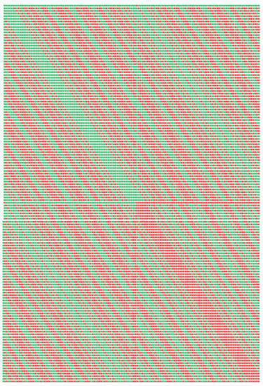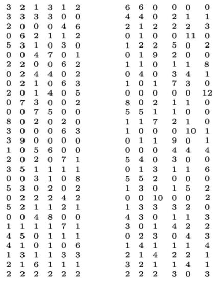 Although harmony is created when notes with certain rational frequency ratios are played simultaneously so as to avoid beats, the irrational number π presents an interesting case study for music compositions. First, the circular symmetry of π itself arises from the ratio of the circumference of a circle to its diameter. Consequently, the digits of π, which do not form any recognizable pattern or sequence, have been of interest in exploring the role of circular or spherical symmetry of music. As outlined in the review article of Maruani et al. [], the digits of π have been used in creating western music compositions. Here we exemplify yet another computer-generated music composition derived from the digits of π. Table 3 shows the first 2048 digits of π, which were converted to integer modulo 7 in order to create a musical composition. The present author created a composition from the digits of π entitled “The soul of π” by mapping 0 to N3 (B Natural) and the remaining integers 1 through 6 sequentially from S (C) to D1 (A flat) and thus setting it to the Hungarian minor scale (see the piano keys at the top of Table 4). All 2048 digits of π were fed into a computer and converted to integer modulo 7 arithmetic, Z7 = {0,1,2,3,4,5,6} in order to create the composition shown in Table 4. As we employ integer mod 7 arithmetic, the generated musical composition does not depend on the representations of π in various number systems. Although the notes in Table 4 that are set to the Hungarian minor scale are derived from the digits of π and are grouped into columns of octets, they can be partitioned into other groups readily. For example, there are more complex rhythmic cycles in the south Indian music system, such as misra or sankeerna chapu, which mean a partition of integer 7 and 9, respectively. Once the rhythmic cycle pattern is chosen, this information can be fed to the computer to generate completely different groups of notes of π for the chosen rhythmic cycle. A principal reason the notes are shown in groups of octets is that it is the most common rhythmic cycle in many musical systems, set in cycles of lengths 8 and 16. Such rhythmic cycles again take the cyclic group patterns either in 8 beats/s or 16 beats/s. Moreover, different speeds such as vilambit (slow; north Indian system), Madhya (medium), drut (fast), or adi-drut (very fast) can be readily created by splitting or coalescing the columns in Table 4 to fit into one of the tempos. The symmetric and melodic nature of the Hungarian minor scale readily lends itself to harmony by choosing notes in rational symmetric proportions for a perfect harmony without creating beats. The digits of π can be readily set to other melodic scales such as the harmonic minor, Dorian, or natural minor by replacing some of the notes in the composition in Table 4.