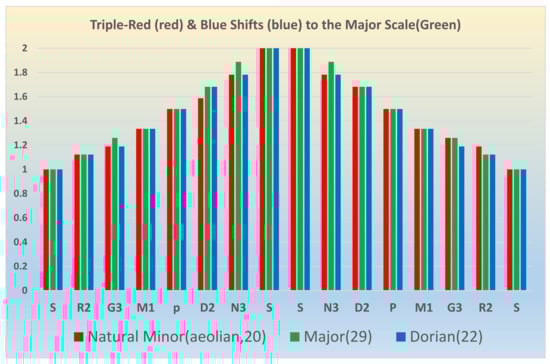 Ever since the time of Pythagoras, scientists, philosophers, and mathematicians have been intrigued by the intimate connection between music and mathematics [,,,,,,,,,,,,,,,,,,,,,,,,,,]. This connection is becoming even more relevant today with a rising interest in artificial intelligence, especially as it pertains to pattern recognition, similarity measures, sound and image perceptions, big data, machine learning, neural networks, and so on [,,,,,,,,,,,,,,,]. The Greek mathematician and philosopher Pythagoras was one of the ancient explorers of the relationship between music and mathematics with the formulation of the diatonic scale system. Although originally these musical notes corresponded to the major diatonic scale comprising the white keys of a piano, the renaissance period witnessed an important metamorphosis made possible by the groundbreaking works of Gioseffo Zarlino and Heinrich Glarean that culminated into the foundations of modern western music theory [,,] of 12-tone system. Zarlino of the renaissance period is credited to have recognized the 12 equal divisions within an octave as opposed to 8, resulting in the metamorphosis from the Pythagorean (6th Century BC: white keys of the piano) to the Zarlino (16th Century CE: 12-tone) scales [,]. Heinrich Glarean’s [] classic 1547 work Dodekachordon (12-stringed instrument) proposed the existence of 12 modes and not the 8 that was assumed earlier. Consequently, the Aeolian modes (9,10) and Ionian modes (11,12) emerged, where the Aeolian mode corresponds to the natural minor, also known as Natabhairavi in south Indian music and Asaveri Thaat in north Indian music systems. Glarean’s Dodekachordon was inspired by the connection between the faces of a dodecahedron (See Figure 1) and musical notes through the introduction of five additional transposed notes (five black keys within an octave of a piano), including the Bb note. As seen in Figure 1, the dualist of the dodecahedron is the icosahedron, when 12 pentagonal faces of the dodecahedron are mapped into the vertices of the icosahedron. They both belong to the icosahedral point group, Ih, containing 120 symmetry operations. The 12 vertices of the icosahedron form 3 mutually orthogonal golden rectangular planes, as shown in Figure 1 (Bottom Right). The golden ratio and its inverse that appear in the character values of the T1,2(g,u) representations of the Ih group provide further insights into the symmetry properties of the 12-tone chromatic scale. Consequently, we have the modern 12-tone chromatic scale system that includes both black and white keys on the piano within an octave. The relationship between an octave and the periodic table of elements in chemistry is well recognized by the formulation of the “Law of Octaves” by Newlands in 1865. The connection between combinatorics and group theory to the periodic table of elements continues to be a topic of several recent studies [,,,,,,,,,].