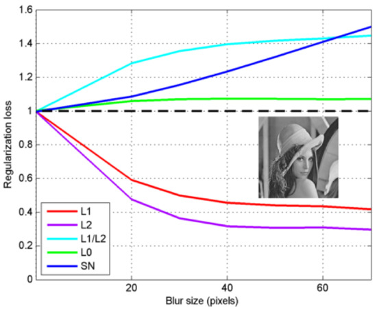 As shown in Figure 1, L1 and L2 regularization decrease as the degree of blur becomes larger. L1 and L2 regularization are more friendly to blurred images, so they are not proper regularizations [5]. Krishnan et al. [19] proposed L1/L2 regularization, which is more friendly to clear images than blurred images. Inspired by L1/L2 regularization, this paper adopts SN, which shows more vital abilities to differentiate clear and degraded images. Next, this paper gives a detailed comparison between SN and other regularization.