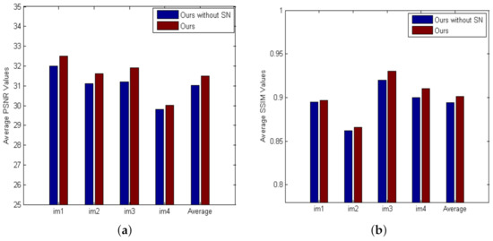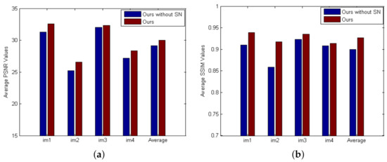Quantitative evaluation of BDA-SN and BDA-SN without SN on the dataset [46]. (a) Comparisons of PSNR. (b) Comparisons of SSIM.