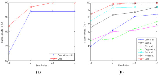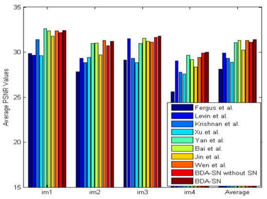 This experiment was conducted on the dataset of Levin et al. [5], containing 32 blurred images generated from four clear images and eight blur kernels. Kernel size ranged from 13 to 27. Other state-of-the-art methods involved in the comparison are those of Krishnan et al. [19], Xu et al. [7], Pan et al. [9], Yan et al. [13], Jin et al. [20], Bai et al. [21], and Wen et al. [27]. Figure 2 shows the kernels estimated by BDA-SN on the dataset [5]. It is evident that kernels estimated by BDA-SN were close to the ground-truth kernels. Figure 3 illustrates the average SSIM and PSNR. BDA-SN reached a higher PSNR than BDA-SN without SN. Figure 4a shows that BDA-SN without SN has a lower success rate than BDA-SN. Figure 4b demonstrates that BDA-SN achieved the highest success rate compared with other SotA methods. When error was 2.5, BDA-SN achieved 100% success. As illustrated in Figure 5, BDA-SN achieves the highest average PSNR in the most advanced methods.