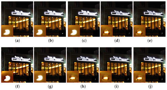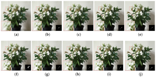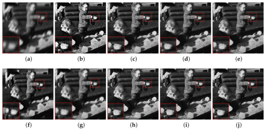 Visual comparison of examples in the dataset [5]. The PSNR and SSIM values are displayed in Table 2. The BDA-SN achieves the highest PSNR and SSIM. (a) Input; the algorithms of (b) Krishnan et al. [19], (c) Xu et al. [7], (d) Pan et al. [9], (e) Yan et al. [13], (f) Jin et al. [20], (g) Bai et al. [21], and (h) Wen et al. [27]; (i) BDA-SN without SN; and (j) BDA-SN.