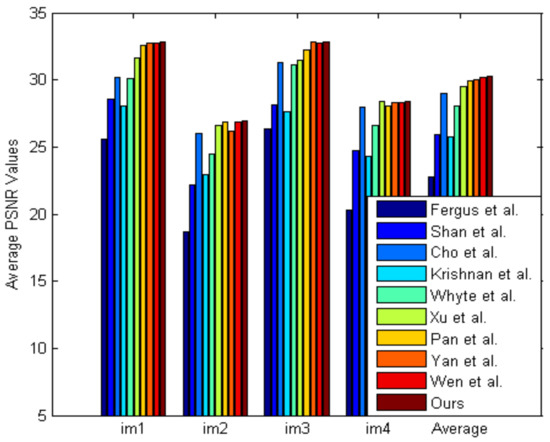 The second experiment was carried out on the dataset of Kohler et al. [46], containing 48 blurred images generated from 4 clear images and 12 blur kernels. The algorithms compared include those of Krishnan et al. [19], Xu et al. [7], Pan et al. [9], Yan et al. [13], Jin et al. [20], Bai et al. [21], and Wen et al. [27]. Figure 7 reveals that the estimated kernels by BDA-SN were close to the true kernels. Figure 8 illustrates the average PSNR and SSIM. BDA-SN reached higher PSNR values and SSIM values than BDA-SN without SN. The results show that SN can significantly improve the performance of the algorithm. Figure 9 demonstrated that BDA-SN achieved the highest average PSNR values compared with other SotA methods.