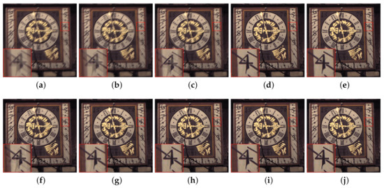 For a better comparison, Figure 10 chooses a challenging visual example that is severely blurred. BDA-SN yields the best visual effect; the number “4” in the red box in the lower left corner has a sharp edge, which is visually more pleasing. The outcome of the algorithm [20] produces ringing artifacts, the consequences of algorithms [7,19] have severe blur effects, and the results of the methods [9,13,27] are too smooth. Table 3 corresponding to Figure 10 shows that the PSNR and SSIM of BDA-SN are the highest.