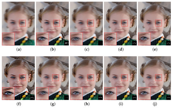 Comparisons on a face image. The image restored with BDA-SN is visually more beautiful. (a) Input; the algorithms of (b) Krishnan et al. [19], (c) Xu et al. [7], (d) Pan et al. [9], (e) Yan et al. [13], (f) Jin et al. [20], (g) Bai et al. [21], and (h) Wen et al. [27]; (i) BDA-SN without SN; and (j) BDA-SN.