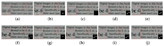Comparisons on a text image. BDA-SN reaches clear details as displayed in red boxes. (a) Input; the algorithms of (b) Krishnan et al. [19], (c) Xu et al. [7], (d) Pan et al. [9], (e) Yan et al. [13], (f) Jin et al. [20], (g) Bai et al. [21], and (h) Wen et al. [27]; (i) BDA-SN without SN; and (j) BDA-SN.