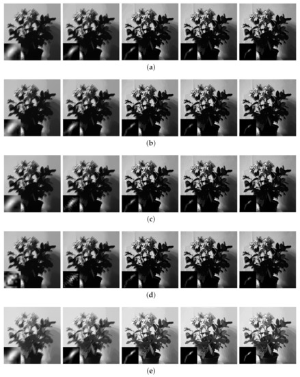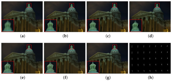 where denotes the Gaussian low-pass filter, denotes the Sobel vertical edge detector impulse response function, and denotes the Sobel horizontal edge detector impulse response function [25]. is the edge protection parameter. This paper chooses a larger value when the image contains more details and, conversely, chooses a smaller value when the image contains less details. Parameter is used to adjust the speed of convergence. In the case of ensuring convergence, a larger value of can be selected to speed up the convergence. In this paper, the size of Gaussian low-pass filter [25] is 5 × 5. For the sake of simplicity, we drop “” in Equations (19) and (20).