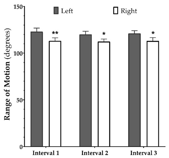 Multiple comparisons ANOVA revealed a significant main effect of laterality (p = 0.006; ηp2 = 0.252). Figure 2 shows the comparison between left and right shoulders for ROM at the different load intensities during BP. Specifically, pairwise comparisons showed a significantly greater ROM of left shoulder compared to right shoulder at all load intensity intervals (Interval 1: p = 0.008, g = 0.52; Interval 2: p = 0.035, g = 0.46; Interval 3: p = 0.015, g = 0.46). No effect of load intensity nor load intensity x laterality was observed (p > 0.05).