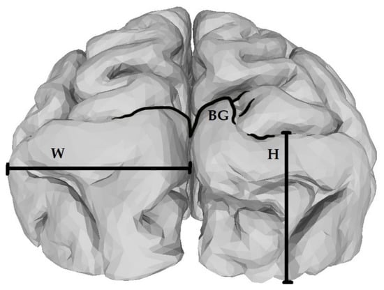 Occipital Measurement Definitions. W = width, H = height. The right hemisphere has a bridging gyrus (BG) not fully operculated by the occipital lobe and was scored as a Y; in the left hemisphere this gyrus is fully operculated, so its condition was scored as an N.