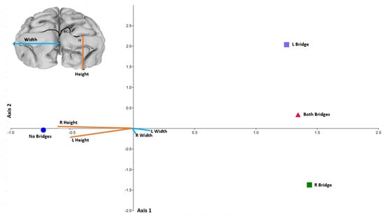 Canonical Correspondence Analysis (CCA) was used to determine the strength of the correlation between different occipital bridge types, and the left (L) and right (R) height or width of the occipital lobe. The presence or absence of bridging patterns requires assessment where the potential correlation between occipital lobe height and width could be assessed against the presence or absence of Left or Right bridging patterns, or whether those with Both patterns were associated more with Occipital lobe width or height. Consistent with CCA, the type of bridging patterns grouped specimens accordingly and the effect of occipital lobe height or width determined. Results indicated that greater occipital width was associated with both Left and Right bridging patterns (Axis 1), while occipital lobe height (Axis 2) was associated more strongly with No Bridging pattern. The correlations between variables indicated by Axis 1 (89% variance) and Axis 2 (11% variance) were statistically significant (p < 0.002) with 1000 permutations (Table 3).