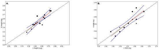 Log-log Ordinary Least Squares (OLS) regression of Occipital lobe fitted with a 95% confidence interval for lobe (A) height and (B) width where black triangles are specimens with a bridging gyrus and black dashed line to emphasize symmetry and asymmetry (the departure from symmetry).