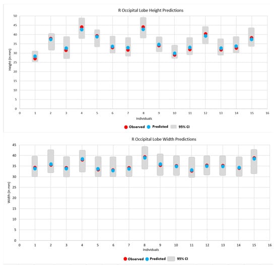 The predictions for both L and R occipital lobe width and height are provided for both known and unknown sample, with predicted values converted from log-units to metrics (in mm) by taking the inverse-log and the observed values reported in parentheses alongside the predicted values (Table 7, Figure 4). Considering there was no discernible difference in pattern of reliability between the hemispheres, only the prediction of R lobe height and width are provided.
