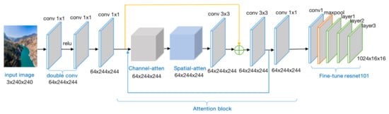 The feature extraction structure designed in this study mainly consists of two parts. The first part uses the attention module composed of the channel attention mechanism and the spatial attention mechanism to detect the significance region, and the second part uses the Resnet-101 [] pre-training network (trained in ImageNet) to extract features.