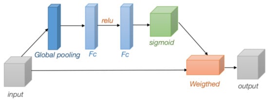 The channel attention mechanism selected in this study firstly uses global pooling to generate statistics for each channel and then constructs two fully connected layers to model the correlation between channels, with the same number of weights for output and input features. Then the normalized weights between 0 and 1 are obtained through the gate of the Sigmoid activation function and weighted to the features of each channel. The output depends on the dependency of each channel. The structure is shown in Figure 3.