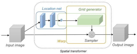 The initial spatial attention mechanism comes from the spatial transformation module proposed by Max, as shown in Figure 4. The spatial attention module is composed of a location net, grid generator, and sampler. Firstly, the important spatial regions in the image are found through the location net, and the transformation parameter is obtained by feature regression. Then the grid generator is used to find the corresponding grid points after transformation. Finally, the sampler fills in the information to get the transformed image. The main task of the location net is to find the spatial position of features through transformation and then obtain the transformation parameter . The grid generator and sampler can be thought of as a component warp, which deforms the input image according to the parameter .