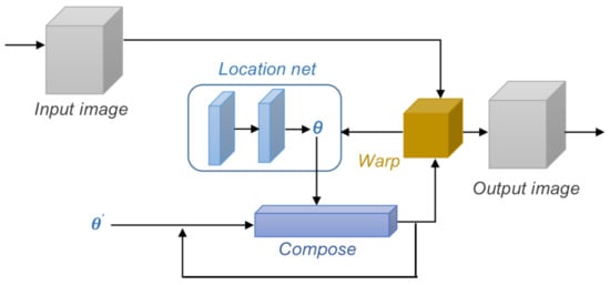 The final output image obtained by the spatial transformation module is essentially determined by the transformation parameter . Through a series of affine transformations, such as rotation, translation, and clipping, the location net finds the saliency region adapted, obtains transformation parameters, and finally achieves the part of interest. However, a problem can appear in this process, as the output image is determined by the transformation parameters. If the transformation parameters are wrong, we will not get the ideal output image. Therefore, to enhance the accuracy of the network, Lin proposed a space transformation module of inverse synthesis for optimizing transformation parameters, as shown in Figure 5.