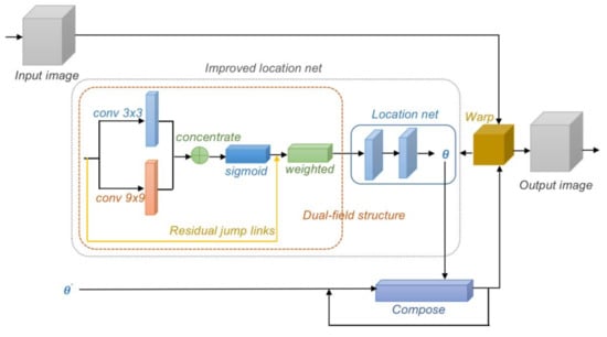 According to the above analysis, the spatial transformation module is used to find the key spatial regions, and the inverse synthesis of the spatial transformation module is used to accurately transform parameters and improve the ability to focus spatial positions. However, over-reliance on spatial transformation parameters may lead to focusing errors. If the prior parameters of the network have deviated, the subsequent inverse synthesis will not improve the accuracy of the transformation parameters but reduce the accuracy of the parameters. To reduce the possibility of error caused by parameters, this study inherits and improves the idea of the inverse synthesis spatial transformation module and proposes an inverse synthesis spatial transformation module with dual-vision fusion, as shown in Figure 6.
