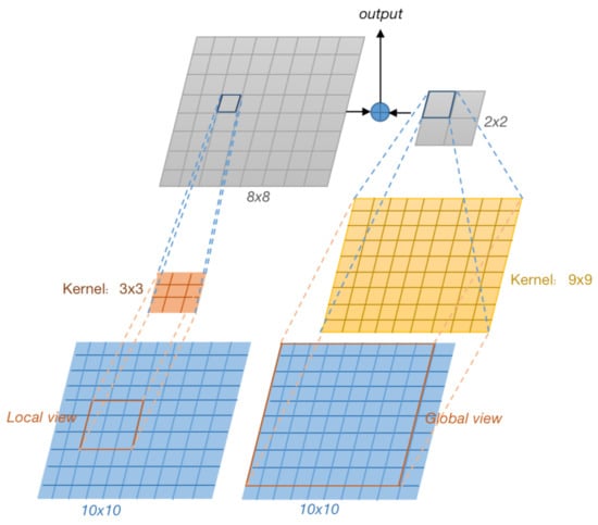 The orange dotted line in Figure 6 shows the dual-field attention structure proposed in this study. Images with more global information distribution prefer larger convolution kernels, while images with more local information distribution prefer smaller convolution kernels. In this study, the convolution layer with 3 × 3 and 9 × 9 convolution kernels are used to extract features from different receptive fields and the local information is fused with the global information, as shown in Figure 7. After fusion, feature maps are weighted by the sigmoid activation function and connected by a jump structure with input feature images. Finally, the attention part outputs the salient images. Compared with the original input image, the image highlights the target area, reduces the interference of other information, and lays a foundation for the location net to output transformation parameters.