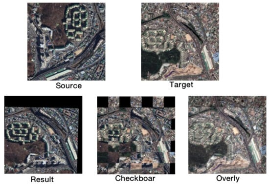 Figure 8 shows a group of multi-temporal urban remote sensing images from the Aerial Image Dataset. The study of multi-temporal urban remote sensing images can effectively observe the urban change dynamics, land coverage rate, and spatial pattern change. Remote sensing registration technology is used to observe the changes of green land cover, construction land, water area land, and farmland, to provide a scientific basis for the ecological planning and construction of the urban landscape. The source image and the target image were taken at different times in the same place. By registering the source image to the target image, the result can keep the road and built-up area aligned. The registration result shows that the land used for buildings is larger than before, while the vacant land is transformed into green plant cover, and the road direction remains unchanged. It provides an analytical basis for future urban construction trends in this region.