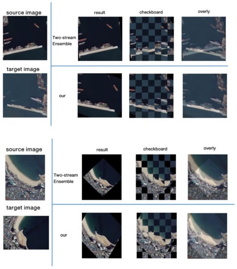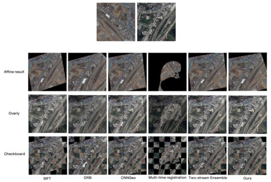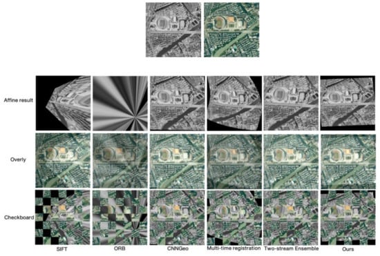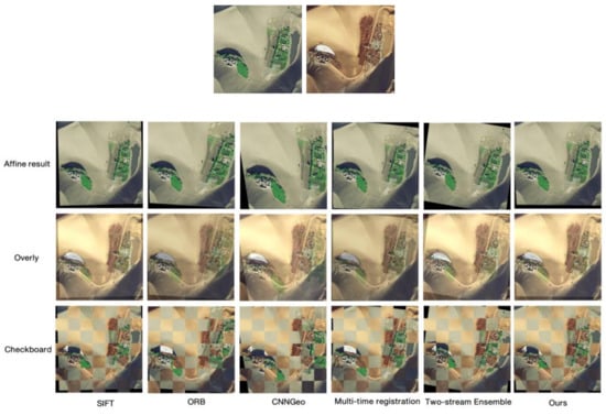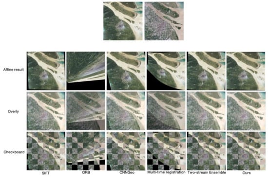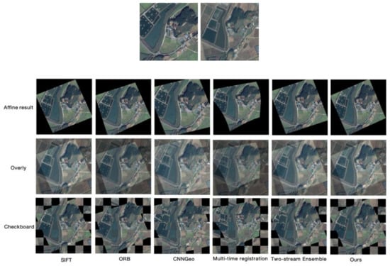 Three groups of registration images were selected from the Aerial Image Dataset for comparing the performance of the algorithms. Figure 11, Figure 12 and Figure 13 show the multi-temporal urban registration results, multi-temporal rural registration results, and multi-temporal island registration results are presented, respectively. The two images at the top of each group are the source image and the target image. The Overly results are used to observe the overall registration, and the Checkboard results are used to observe the local detail registration. By comparing the registration results in this study, the algorithm in this paper can be seen to have the highest registration accuracy compared to the other five algorithms.