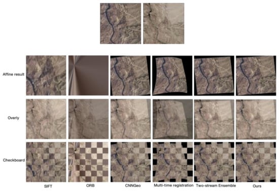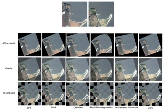This study compares five remote sensing image registration algorithms containing two classical algorithms, ORB [] and SIFT [], and three deep learning-based registration algorithms developed in recent years—CNNGeo [], Multi-time Registration [], and Two-stream Ensemble []. At the same time, the model based on deep learning was retrained on the dataset in this study, and the parameter settings were the same as our experimental settings.