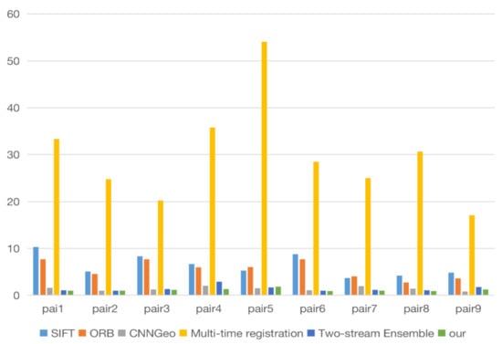 A time efficiency evaluation was performed on the three datasets above, as shown in Figure 20. The abscissa is tested by the three groups of multi-temporal image pairs from the Aerial Image Dataset, and the ordinate is the running time in seconds. The six methods of comparison are represented by bars of different colors. As can be seen from Figure 20, the running time of the method in this study is much lower than that of the Multi-time Registration method, and it runs more efficiently than the other methods. Additionally, in relation to CNNGeo and the Two-stream Ensemble, our method design, using an end-to-end pre-trained model, when it is compared with the model without pre-training, shows a faster training rate and higher running efficiency.