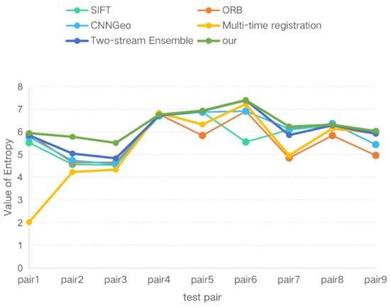 In this study, not only does the accuracy index measure the correlation between the registration error and the registration results, but also the Entropy index is used to measure the information of the registration results, which can reflect the degree of dispersion of the registration points in the image spatial distribution. The higher the degree of dispersion, the more accurate the transformation parameters obtained by the model. In Figure 21, the method proposed (shown in the green broken line) is always at the top. This indicates that the Entropy value of the proposed method is the highest in the measured image, that is, it shows the method to have the highest accuracy.