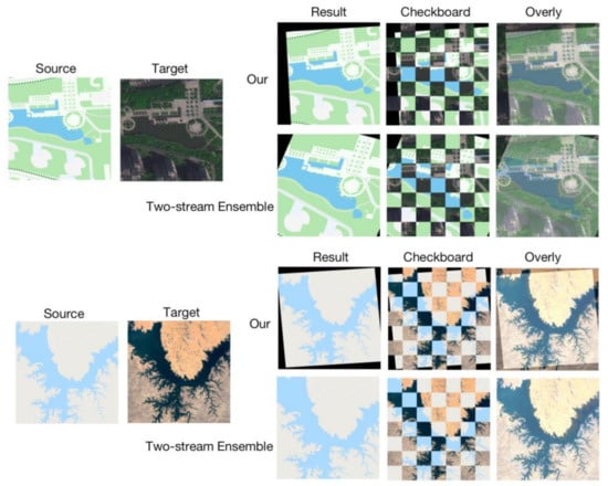 The image in Figure 24 is a map-optical registration and Figure 25 is an SAR optical registration. We compare the proposed method with the Two-stream Ensemble method. The experimental results show that our method has accurate matching results on multi-temporal datasets and has greater expansion on other datasets. To summarize, the proposed method improves the precision of registration and maintains the strong robustness of deep-learning methods at the same time. Additionally, it has strong practicability and a wide scope of application.
