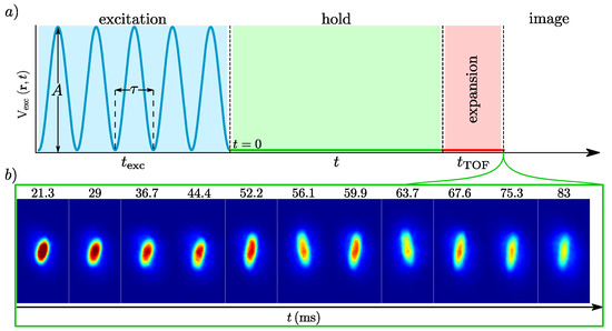 After the excitation is turned off, we hold the cloud for a time t inside the trap, often called holding time, which is varied from 20 to 90 ms. During this time, the temporal evolution of the momentum distribution , which we are interested in, occurs. Next, we turn off the trap potential and measure using absorption images taken from the ballistic expansion of the cloud after a time of flight (ToF) of . In Figure 1b, we show typical absorption images corresponding to an excitation amplitude of for different holding times t.