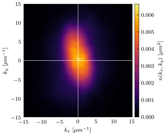 For each excitation amplitude and holding time, we perform several realizations of the experiment and then average the results. In Figure 2, we show a typical two-dimensional momentum distribution obtained from the absorption images. The distance that an atom has traveled from the center of the cloud, after a time , is given by , where m is the mass of a rubidium-87 atom. Thus, in practice, the ToF technique corresponds to a Fourier transform of the spatial distribution, which yields the momentum distribution, . There are known shortcomings of the ToF technique, which do not significantly impact the measurement of our momentum distributions, mainly because the turbulent state is kinetically dominated [19]. For a more detailed discussion, the reader is referred to Reference [12] and references therein. This technique has been used successfully in the past to obtain the momentum distribution of turbulent trapped BECs [6,7].