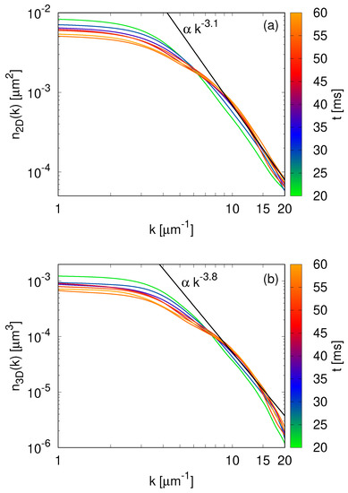A power law is simply a line in a log–log plot of the momentum distribution as a function of k. We then look for a time window when, in a certain k-range, is proportional to , the particle cascade characteristic of a turbulent cloud. We performed the experiment described in Section 2 employing six different excitation amplitudes. For only the three highest ones, A = 1.8, 2.0, and 2.2 , we observed the appearance of a power-law, around 35 ms and in the region 10 m 15 m. We found the exponents and , which lead to . It is interesting to see that even in our finite-sized non-homogeneous system inside an anisotropic trap, we still have close to one.