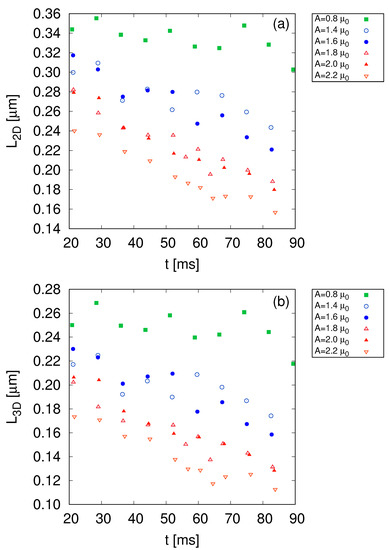 For small excitation amplitudes, 0.8 , the system is only slightly disturbed and removed from equilibrium, but it does not have enough energy to reach what is considered a disordered state. In this case, it evolves differently from the others, and the value of L is approximately constant with time.