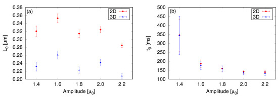 (a) Extrapolation of the characteristic length scale to the instant when the excitation is turned on, , and (b) the characteristic time of the particle transfer, , as a function of the excitation amplitude. The results were obtained fitting the data to the functional form of Equation (8). Although the analysis employing two- or three-dimensional momentum distributions produces different values of , both approaches yield the same values for the characteristic time.